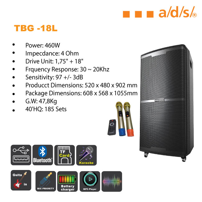 Điểm đặc sắc nhất ấn tượng nhất của loa vali kéo ADS TBG 18L đó là thiết kế loa bass lên đến 50 cm đây có thể nói là kích thước quá khủng bố cho một chiếc loa kéo ở phân khúc giá trên 8 triệu thông thường ở những loa kéo cùng phân khúc cùng lắm cũng chỉ đến 4 tấc mà thôi chính vì thế không có gì đáng kinh ngạc tại sao chất lượng âm thanh lại tuyệt vời đến thế, Tần số thấp xuống rất sâu, chắc khỏe, đảm nhiệm rất tốt các bài nhạc rook, rap, nhạc remix và karaoke.